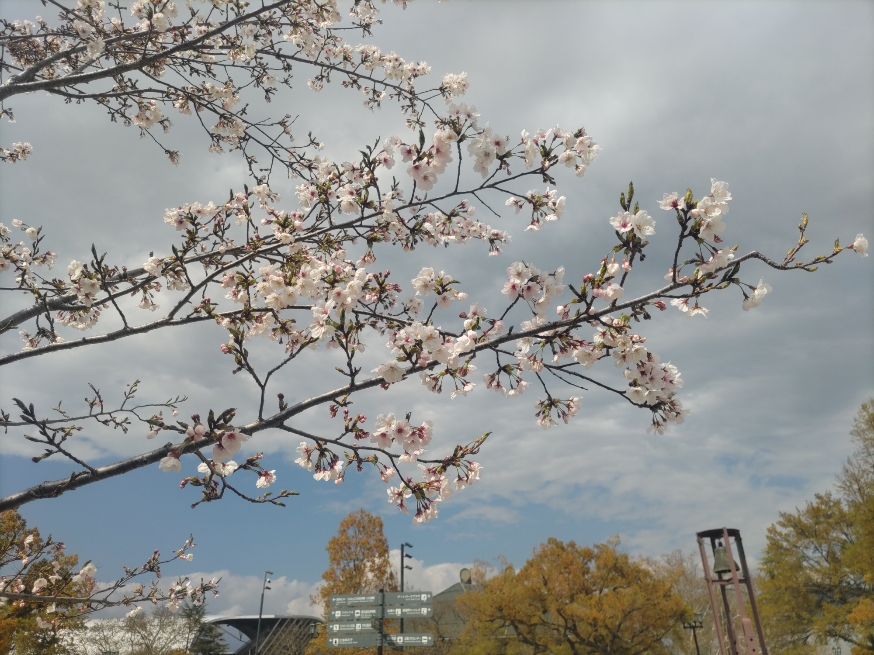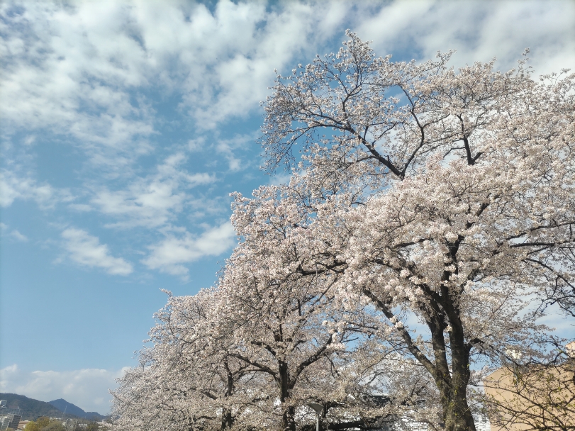 桜の開花宣言からあっという間に満開になり、「春に三日の晴れなし」の諺どおり、ゆっくり楽しむ暇もないまま雨がひどく降ったので、すぐに散ってしまうのではと少し残念に思っていたのですが、雨上がりで澄んだ青空の下で桜が美しく咲いているのを見られました。