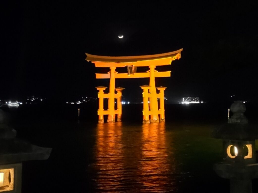 酔い覚ましに厳島神社の入り口まで参道を歩くと、三日月の下、海の中に立つ鳥居がライトアップされて、とても幻想的でした。