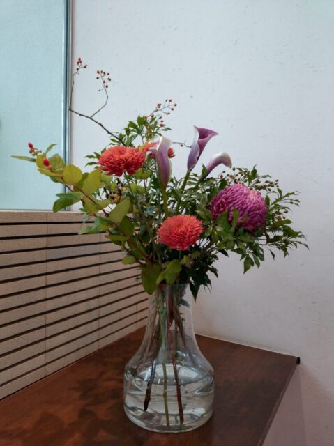 私は、花瓶の中で日々紅葉している薔薇の実が気に入っています。 他にも菊やカラーなど、ぜひ秋の花をお楽しみください。